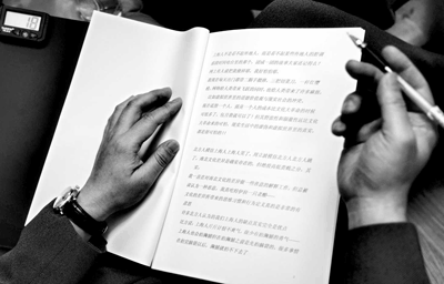 一邊用圓珠筆修改著新鮮出爐的段子,周立波一邊向記者介紹,“提綱三天一改,我會(huì)增加一些時(shí)事新聞,比如犀利哥和豐田事件都是為今天的演出新增的!痹诖_認(rèn)一處關(guān)于奧巴馬的“笑料”時(shí),周立波突然向身邊的助手詢問道,“奧巴馬是什么時(shí)候到上海的?”身邊的工作人員面面相覷,一時(shí)語塞。而在以往,一想到什么新包袱,或者需要什么意見,周立波首先想到的自然是“阿哥”。