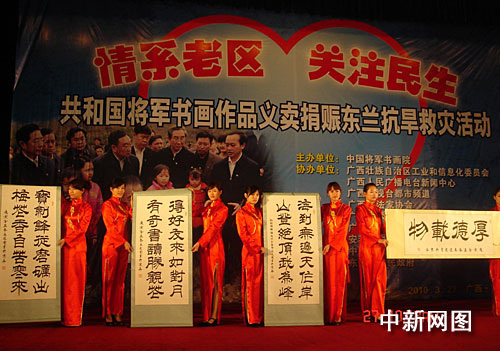 中新網(wǎng)南寧3月27日電(記者 羅先彬)2009年8月份以來(lái),廣西革命老區(qū)東蘭縣境內(nèi)持續(xù)干旱,人畜飲水困難,農(nóng)業(yè)生產(chǎn)受影響嚴(yán)重。東蘭縣嚴(yán)重的旱情,牽動(dòng)了一群遠(yuǎn)在北京的共和國(guó)老將軍的心:中共第十二屆至第十五屆中央委員、原沈陽(yáng)軍區(qū)、蘭州軍區(qū)司令員、軍事科學(xué)院院長(zhǎng)劉精松上將,和其他八位老將軍,不顧年高體弱,千里迢迢趕赴南寧,獻(xiàn)出自己精心創(chuàng)作的114幅書(shū)畫(huà)作品進(jìn)行慈善義賣(mài),所得114萬(wàn)元全部捐給東蘭人民,用于目前的抗旱救災(zāi)。