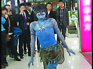 擁擠的中關(guān)村電子賣場,一位舞者化身成電影《阿凡達(dá)》里的納美人,伴隨著《大河之舞》的音樂正大跳踢踏舞,藍(lán)色的腳尖踩踏的不是地板,而是9臺筆記本……這段被市民拍下的視頻在網(wǎng)絡(luò)上瘋傳,網(wǎng)友評價(jià)其為“史上最具幻想力的商家宣傳”。