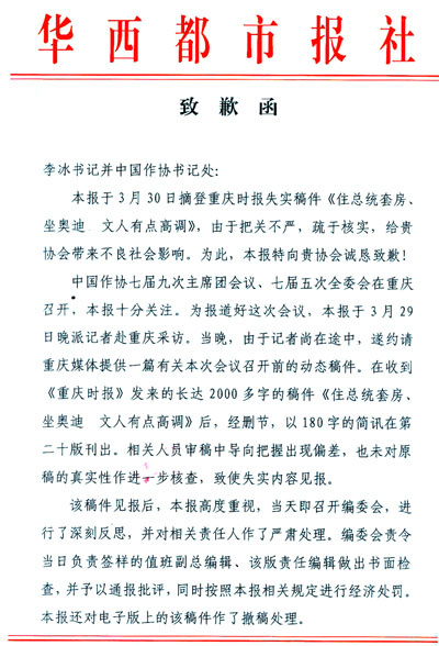 報道此事的《華西都市報》也向中國作協(xié)發(fā)出了致歉函。致歉函稱:本報于3月30日摘登重慶某媒體失實稿件,把關(guān)不嚴,疏于核實,給貴協(xié)會帶來不良社會影響。為此,本報特向貴協(xié)會誠懇致歉。