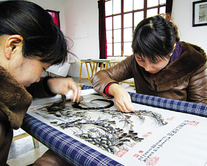 “兩會”剛結(jié)束,東臺發(fā)繡藝術(shù)館就著手合璧發(fā)繡的《富春山居圖》高級工藝美術(shù)師陳春生著筆臨摹了10天,在原《富春山居圖》繡作前端加上寬33厘米、長66厘米的《剩山圖》。藝術(shù)館特地挑選了有30年發(fā)繡經(jīng)驗(yàn)的親姐妹單素蘭和單素萍來執(zhí)針刺繡。兩位繡娘經(jīng)過20天全日制滿負(fù)荷的工作,4月10日,《剩山圖》終于刺繡完成。