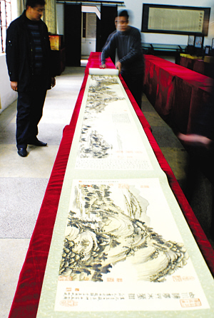 今年“兩會”期間,溫家寶總理說出了讓傳世名畫《富春山居圖》合璧的心愿。昨天,從東臺市傳出消息,該市的工藝美術(shù)工作者運(yùn)用“民間一絕”的頭發(fā)刺繡技藝,照原樣大小成功制成了一幅發(fā)繡長卷,完整再現(xiàn)了原畫的全貌,使這幅名畫分割在海峽兩岸的兩部分在發(fā)繡藝術(shù)天地里完美合璧。