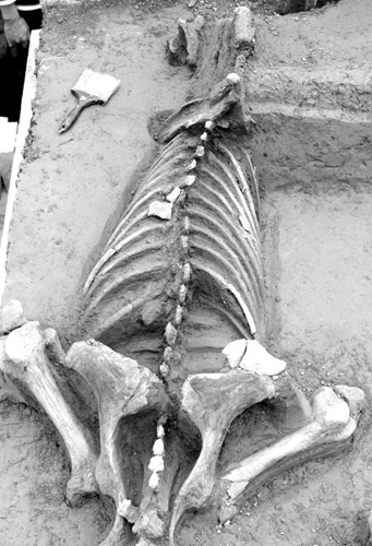4月 12 日上午,高青陳莊遺址發(fā)掘?qū)<已杏憰谑〔┪镳^舉行,來自中國社科院、北京大學(xué)等單位的多位考古專家,對幾個月來的考古成果進(jìn)行了論證?脊湃藛T發(fā)現(xiàn)馬匹均呈“直立跪伏”狀,非常罕見。