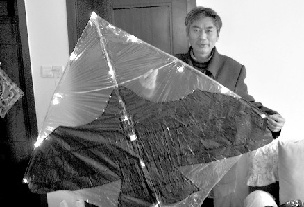 昨日下午2時許,在東坡路靠近清水河的一塊空地上,一只黑色的風(fēng)箏正在天空中翱翔。在不遠(yuǎn)處,一位身著黑衣的白發(fā)老人正拿著絞盤,不斷地放線收線,其他幾位老人則抬著頭議論紛紛。放風(fēng)箏的老人名叫戚勉休,今年69歲,而他就是前晚放飛發(fā)光風(fēng)箏的人。