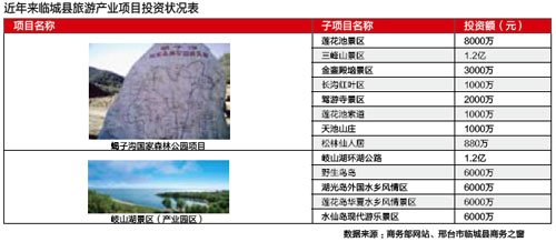 之所以這樣做,對兩地來講都有幾分無奈。臨城多年來苦于沒有一張城市的文化名片,該縣旅游資源豐富,崆山白云洞、天臺山、歧山湖、小天池、宋代普利寺塔 、唐代邢窯遺址。旅游產(chǎn)業(yè)初具規(guī)模,項(xiàng)目投資也很大(見附表),但是,一直缺乏自己的城市名片和旅游品牌,嚴(yán)重制約了當(dāng)?shù)芈糜螛I(yè)的大發(fā)展。