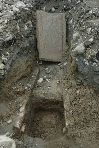 近日,四川省江油發(fā)電廠在維修老廠區(qū)染料車間道路時發(fā)現(xiàn)古墓,廠方立即停工保護現(xiàn)場并報告市文管所前來調(diào)查。該墓葬為唐代石槨墓葬。墓長2.45米,寬1.2米高0.9米,墓葬距地表1.1米。清理出土有開元通寶錢幣、鐵器殘件、瓷片、陶片殘件等文物標(biāo)本。
