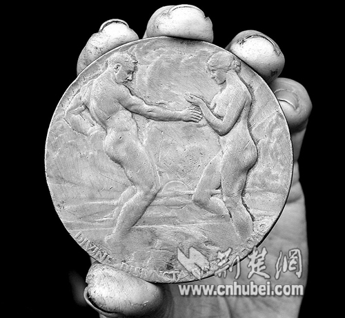 記者在艾家看到,這是一塊澄黃的圓牌,直徑約70毫米,獎(jiǎng)牌一面是一對青年男女,另一面是一棟建筑,寫有“巴拿馬太平洋世界博覽會(huì)”的英文字樣(如圖)。