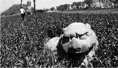 永昌陵石雕散布在麥田里周邊有十來個(gè)小化工廠,“一下雨常是酸雨”