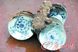 記者了解到,古沉船經(jīng)清淤后現(xiàn)身的3組木質(zhì)隔艙板位于沉船中部,其中一塊已經(jīng)現(xiàn)出約4米長的一段。隔艙板之間,已能夠清晰看到碼放整齊的一摞摞瓷器等文物。成摞瓷器基本上都是側(cè)立橫放并交錯碼放?脊抨爢T在水下見到的文物種類主要是青花瓷大盤,也有少量碗、缽、杯及金屬凝結(jié)物。而目前已出水文物主要類型也仍然是外銷瓷器青花瓷大盤、碗、缽、杯、罐、瓶等,此外還有釉陶罐、鐵鍋及銅板等。瓷器的主要產(chǎn)地確定為福建平和窯及江西景德鎮(zhèn)。