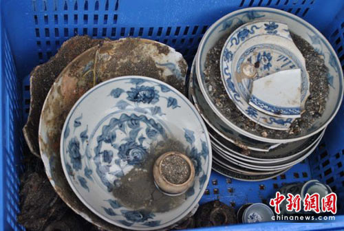 “南澳Ⅰ號”水下考古發(fā)掘于4月上旬開始,但由于南澳天氣、海況復(fù)雜多變,水下考古、文物打撈工作被迫中斷。從本月1日開始,南澳天氣狀況有所好轉(zhuǎn),水下考古工作重點開始從外圍和表面散落文物的采集,轉(zhuǎn)向沉船區(qū)域內(nèi)沉船船體及船載文物的發(fā)掘。目前已經(jīng)清理可見的文物種類主要是青花瓷大盤,也有少量碗、缽、杯及金屬凝結(jié)物。