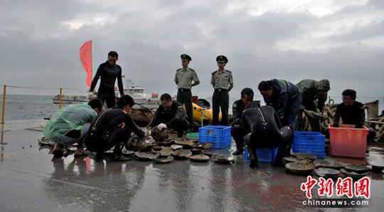 在打撈船上,還有一道獨特的亮麗風(fēng)景,他們是廣東汕頭邊防支隊派駐“南天順”打撈船,對出水文物和考古專家實施安全警衛(wèi)的邊防官兵?梢钥吹竭叿拦俦殖3個小組,其中一組負(fù)責(zé)水下文物出水區(qū)的警戒,一組負(fù)責(zé)文物沖洗區(qū)的警戒,一組負(fù)責(zé)在打撈船上的機動巡邏。另外,汕頭邊防支隊還派出1艘公安邊防巡邏艇和2艘摩托艇負(fù)責(zé)海上警戒,及時勸離不明船只靠近該海域,以免影響打撈工作。
