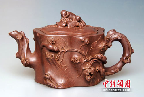 宜興紫砂與“世博”淵源頗深,歷史上曾多次參加世界性博覽會并獲大獎。記者現(xiàn)場看到,在歷屆國際性展覽中獲獎的6件珍品在展廳內(nèi)光彩耀目,其中在1910年“第一次南洋勸業(yè)會”上獲金獎的范大生“大柿子壺”、1915年美國巴拿馬國際賽會獲金獎的程壽珍“掇球壺”、1926年美國費城藝術博覽會獲金質(zhì)獎的馮桂林“松鼠葡萄壺”等珍品引來眾多文化藝術界人士爭相一睹芳容。