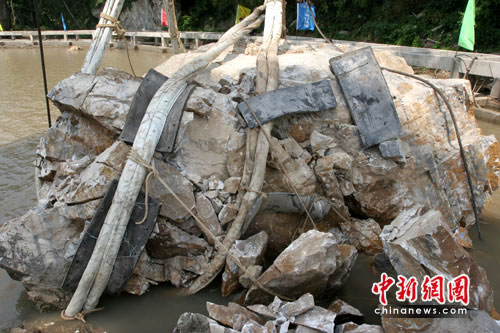 中新網(wǎng)鎮(zhèn)江6月4日電(趙國財(cái) 唐娟)4日下午,首塊《瘞鶴銘》摩崖石刻疑似殘石被巨型“勇士號(hào)”浮吊船吊起約半米后發(fā)生碎裂,首次起吊被迫終止。在打撈人員下水清理碎石后,傳來最新消息!动廁Q銘》打撈項(xiàng)目現(xiàn)場(chǎng)總指揮王雷介紹,碎裂的石頭不會(huì)對(duì)其他三塊預(yù)備打撈的石頭造成損壞。相較于首塊殘石,他更寄希望于壓在該石下面的殘石。他表示,爭(zhēng)取一周后展開第二次打撈。