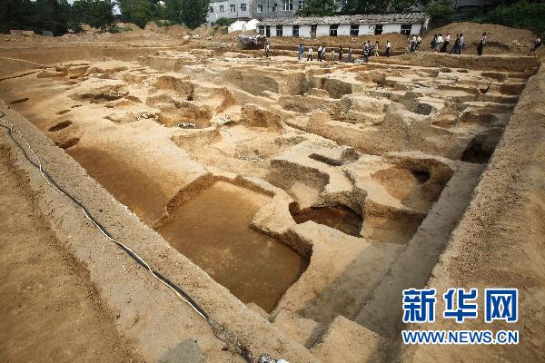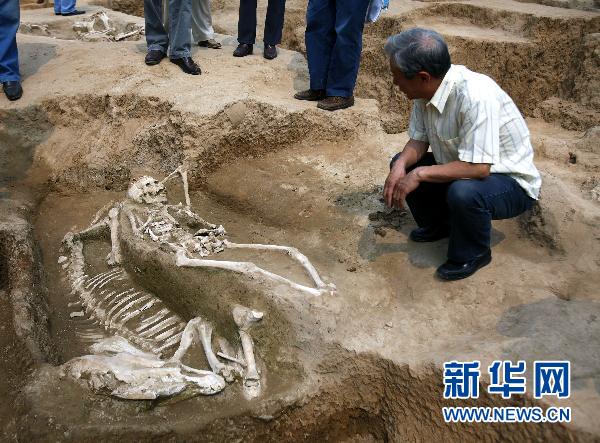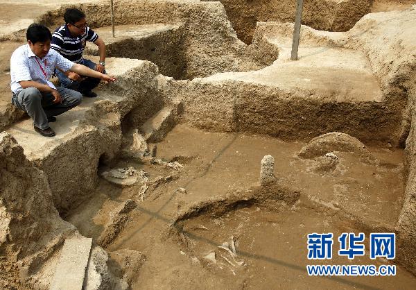 這是6月6日拍攝的洛陽(yáng)市林校西周洛邑祭祀遺址的人馬組合坑。當(dāng)日,河南洛陽(yáng)市文物局組織專家對(duì)洛陽(yáng)市林校西周洛邑祭祀遺址考古發(fā)現(xiàn)進(jìn)行研討并向媒體發(fā)布了發(fā)掘成果。這處遺址西距瀍河約1公里,西北距北窯西周墓地及西周鑄銅遺址約4公里,總發(fā)掘面積為945平方米,于2009年2月開(kāi)始發(fā)掘?脊湃藛T在洛陽(yáng)市林校工地共發(fā)現(xiàn)西周灰坑59座、流水溝1條、墓葬14座以及唐代灰坑42座,其中31座西周祭祀坑的發(fā)現(xiàn)是本次發(fā)掘的重要收獲,為尋找西周洛邑城址提供了又一重要線索。新華社發(fā)(張曉理 攝)