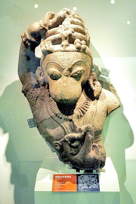 記者在2007年河南博物院舉辦的“西天諸神”展覽中見到過來自印度國家博物館的石質(zhì)“神猴哈奴曼胸像”(左圖)。這件神猴雕像雖然只存上半身,但形象確實(shí)酷似孫悟空。