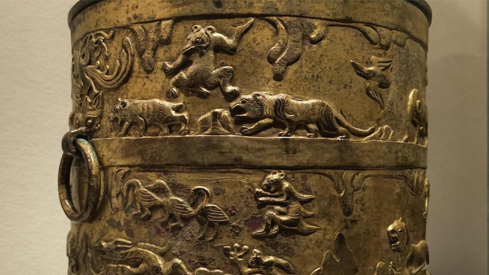 在山西博物院的“民族熔爐”展廳內,一對光彩奪目的鎏金銅樽引人注目。是什么原因使得中原元素與草原風情同時出現(xiàn)在這件銅樽上?