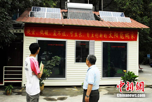 記者看到,這間鋼架結(jié)構(gòu)的房屋功能齊備,雖只有10余平米,但衛(wèi)生間、沐浴間、客廳、臥室一應(yīng)俱全。該房子的主人、退休工程師朱培世告訴記者,房子是由他和團(tuán)隊(duì)成員花了10個(gè)月左右的時(shí)間完成,屋頂上裝有4大塊太陽能板,屋內(nèi)的熱水、通風(fēng)、照明、供暖、甚至降溫都由這幾塊太陽能板提供的能量完成,是一座名副其實(shí)的太能房屋。其方倉建筑、儲(chǔ)冷降溫、太陽供暖、多功能窗、電池支架還獲得國家專利。