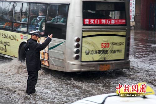 上午9時(shí),武漢市京漢大道武勝路口出現(xiàn)漬水,最深處積水達(dá)40cm,一些小轎車駕駛員由于不了解漬水深度盲目行車而致機(jī)動(dòng)車熄火。因該路段過往車輛頻繁,漬水容易造成道路堵塞,一些民警站在水中充當(dāng)路標(biāo),為車輛安全行走引導(dǎo)方向。
