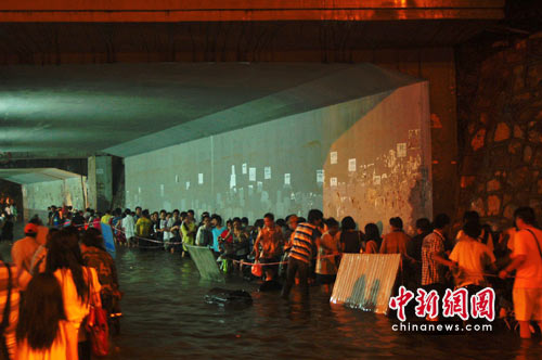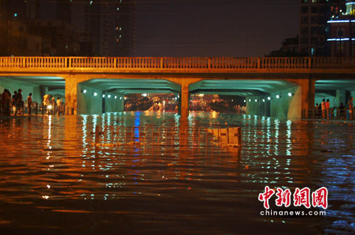 13日晚9時(shí)左右,記者來到武漢市江漢區(qū)新華下路沿線,人行道上漬水已達(dá)30厘米左右。其中,5米高的鐵路橋涵洞被淹去近半,最深積水處超過2米,整條道路交通基本癱瘓。許多市民在經(jīng)過此路段時(shí),不得不卷起褲腳、提著鞋子涉水通過。