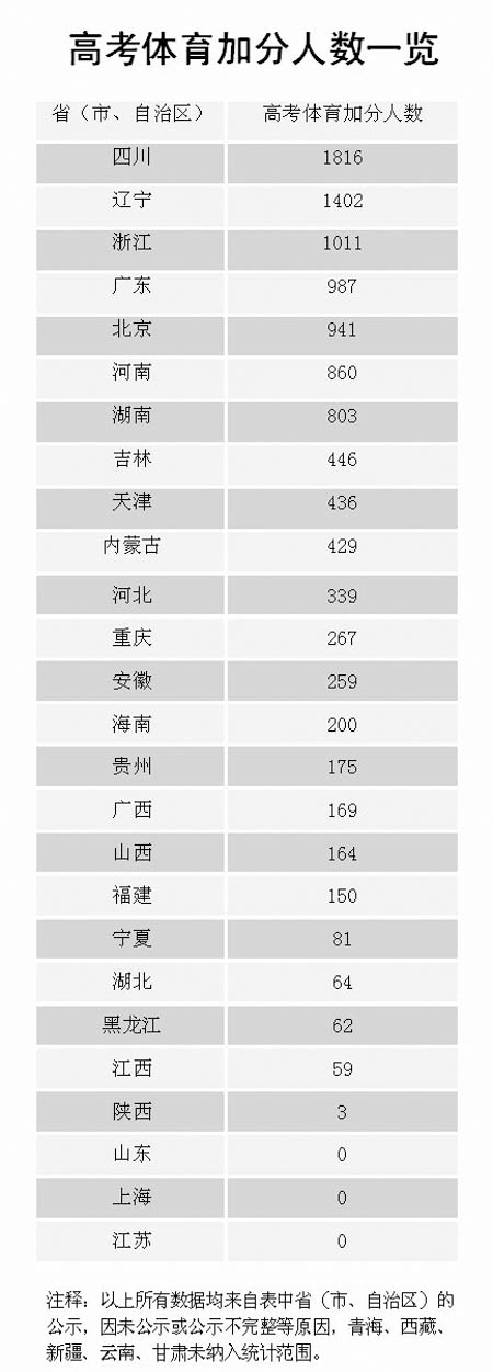 很多省份對(duì)體育加分項(xiàng)目并沒有做出詳細(xì)說明,如福建、吉林,只標(biāo)明了“經(jīng)省教育廳、體育局認(rèn)定的國家二級(jí)以上運(yùn)動(dòng)員”;天津、新疆也未明晰具體體育項(xiàng)目。貴州和河南也只是簡單地區(qū)分了“重大體育比賽”及“國家二級(jí)運(yùn)動(dòng)員(含)以上”。 實(shí)習(xí)生 周薇
