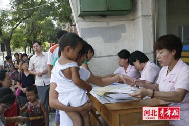 昨日7時許,家住石市新石小區(qū)的孟先生就帶著孩子來到橋西區(qū)婦幼保健站,不料前面已排起長隊(duì),身后還陸續(xù)有家長帶著孩子趕來。