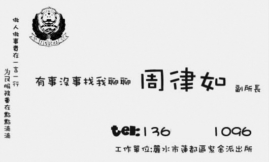 “有事沒事找我聊聊。”學(xué)生周律如設(shè)計的名片上用活潑的美術(shù)大字寫了這么一句話,落款是自封的“周律如 副所長”!昂呛,副所長當(dāng)然只是假想,不過我覺得要多和群眾接觸,才能做好服務(wù)嘛,所以我就這么設(shè)計啦!”小周說。