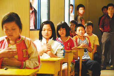 “有了教室,有了生命,我們能夠在廢墟中站立起來(lái),開(kāi)始更美好的生活,我們強(qiáng)不強(qiáng)?”——在董慧娟的帶領(lǐng)下,28個(gè)孩子舉起右臂,右手握拳,喊出“強(qiáng)!強(qiáng)!強(qiáng)!”的口號(hào)。