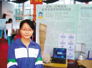 因?吹讲簧俳刂咭蚺洳坏胶线m的假肢,而出現(xiàn)殘肢下端過(guò)敏,甚至潰爛的慘狀,華南師范大學(xué)附屬中學(xué)高二的潘瑩,她便發(fā)明“可調(diào)型雙囊腔假肢內(nèi)襯墊”。該發(fā)明不但獲得大獎(jiǎng)無(wú)數(shù),還申請(qǐng)了國(guó)家專利,并已進(jìn)行臨床實(shí)驗(yàn)。潘瑩說(shuō),希望自己的發(fā)明能在2年后,令截肢者舒適地使用假肢。