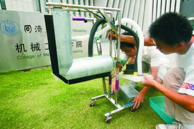 “保潔機(jī)”將代表上海參加10月份在武漢舉行的第三屆全國(guó)大學(xué)生機(jī)械創(chuàng)新設(shè)計(jì)大賽全國(guó)總決賽。這些天,幾名設(shè)計(jì)者正在對(duì)奧運(yùn)場(chǎng)館的保潔工作進(jìn)一步調(diào)研,完成后將提出改進(jìn)方案,進(jìn)一步提高保潔機(jī)的去污能力。(實(shí)習(xí)生 楊通梅 記者 張智麗)