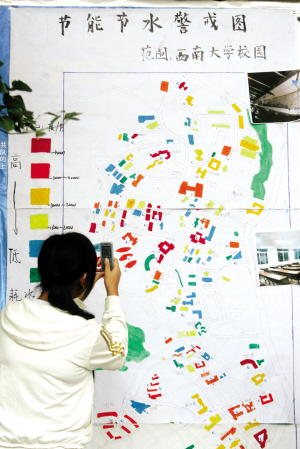 “我們寢室的用電量竟然排全宿舍第一! 10月11日上午,這張“校園節(jié)能地圖”出現(xiàn)在西南大學(xué)廣場的展板上,吸引了不少同學(xué)的眼球。校內(nèi)的教學(xué)樓、宿舍和道路的用水量和用電量,都以鮮艷的顏色標(biāo)注在地圖上,教學(xué)樓則成為用電量最大的區(qū)域。