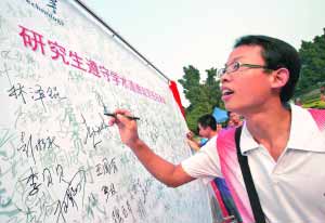 昨日(23日)下午,華南理工大學(xué)舉行第十五屆研究生文化節(jié)開幕儀式,本屆活動(dòng)的“學(xué)術(shù)道德宣誓”和“千人學(xué)術(shù)道德大簽名”屬高校首創(chuàng)之舉,上千名研究生由研究生會(huì)主席帶頭舉行學(xué)術(shù)道德集體宣誓尤其壯觀,并在簽名板上簽名,以表達(dá)對(duì)學(xué)術(shù)抄襲的反對(duì)態(tài)度。