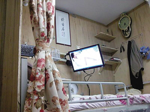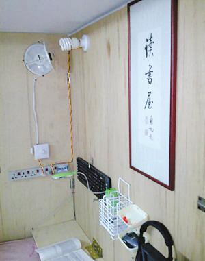 從論壇發(fā)布的照片上可以看到,三張木板及花色窗簾構造了一個豐富的私人空間(圖一)。內(nèi)有照明、電腦及空氣循環(huán)設備,可伸縮的電腦屏幕和可隨時收合的寫字臺,鍵盤、鼠標和耳機掛在墻上(圖二),使用的時候只要旋動一個旋鈕,東西就可以拿下來在任何地點使用。這個狹小的空間內(nèi)還有三層木架,可放生活用品(圖三)。最吸引人注目的是該男生還在床頭掛了一幅墨寶——“讀書屋”。給人的總體感覺是,這是一個富有創(chuàng)意又勤奮好學的學生。