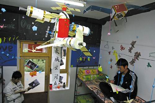 寢室一位來自貴州的同學(xué)黃貴強(qiáng)介紹,貼在墻面上的宇宙圖是幾個同學(xué)花了4個通宵用蠟筆一筆一筆的畫出來的,制作過程可謂艱辛萬苦,而空間站模型、星星等也是大家找的廢紙料、百事貼等生活廢品做出來的,僅是制作道具就用了近一周的時間。