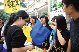 據(jù)了解,今年“搞搞新意思”的地方在于,老師也成為檔主,教導(dǎo)處5個(gè)老師注資一千多元開(kāi)一個(gè)“雙飛翼”檔,所賣雞翅都是一位客家籍貫的老師以30幾元一包的價(jià)格從家鄉(xiāng)處買來(lái)的,而海報(bào)也是美術(shù)老師畫(huà)的。譚娟娟老師表示,所賺到的錢將捐給關(guān)工委幫扶小組和校內(nèi)有困難的同學(xué),“加入了慈善的因素,有不少學(xué)生并不是真的喜歡吃,是為了幫助人才來(lái)‘幫襯’,這體現(xiàn)了他們的愛(ài)心,而且老師跟學(xué)生一起參與,體現(xiàn)平等。