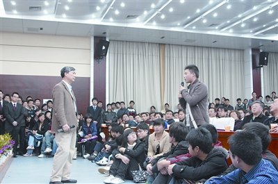 據(jù)了解,這場(chǎng)見面會(huì)并未對(duì)外界媒體公開,僅在校園BBS上發(fā)了個(gè)消息。晚7時(shí)30分,記者作為旁觀者坐到該校經(jīng)濟(jì)學(xué)院報(bào)告廳內(nèi),無(wú)意窺見了一場(chǎng)有意思的學(xué)生們所稱的“培根叔見面會(huì)”。