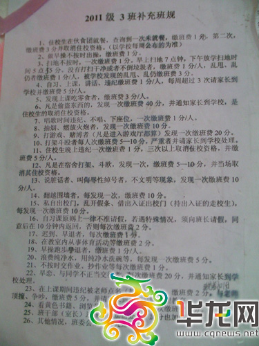 如此多的學(xué)生被扣分、罰款,其依據(jù)是什么?在班上同學(xué)的指引下,記者在該班教室進(jìn)門靠左的墻上看到兩張《2011級(jí)3班補(bǔ)充班規(guī)》,班上同學(xué)告訴記者:該班規(guī)就是扣分、繳罰款的依據(jù)。
