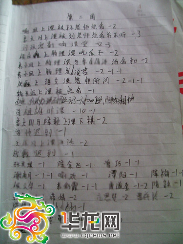 記者翻開其中一頁,看到的便是第2周班上同學(xué)的扣分情況,該情況詳細(xì)記錄了哪位同學(xué)因何事,而被扣了多少分。