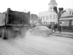 顧北東路是一條新建馬路,寬敞平坦,但一過富聯(lián)路,往東到顧村中心幼兒園門口就中止了,成了一條斷頭路,盡頭就是這個(gè)大型車停車場(chǎng)的唯一“入口”。每天,土方車、集卡、垃圾車來來往往川流不息,車輪帶出的泥土將顧北東路弄得到處是泥。車輛一過,塵土飛揚(yáng),如刮沙塵暴;雨天,水泥路成了泥漿路,人們稍不留神就會(huì)摔跤。