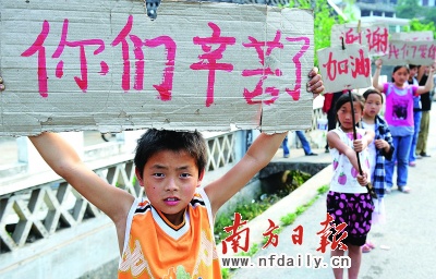 去年“5·12”大地震后,徐廣高舉著寫有“你們辛苦了”字樣的感恩牌向路過的救災隊伍致謝,此事被眾多媒體報道后,人們稱他為“舉牌娃娃”。 2008年6月6日,徐廣和其他130多名來自青川馬鹿鄉(xiāng)小學的同學開始了在東莞的復學之旅,他們被分別安排在博雅外國語學校和石碣的勤徑小學就讀,所在班級被命名為“汶川班”,而這學期他們都選擇了返鄉(xiāng)復課,班級的名字是別有深意的“川莞班”。