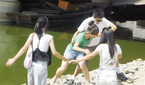 一群大學生在大胡同附近的河邊“演戲”,有人扮演輕生者,有人扮演勸阻者,他們這樣做是想向同齡人宣傳珍愛生命。不過,在不少圍觀者看來,在鬧市區(qū)如此“演戲”,作秀的成分似乎多于宣傳。