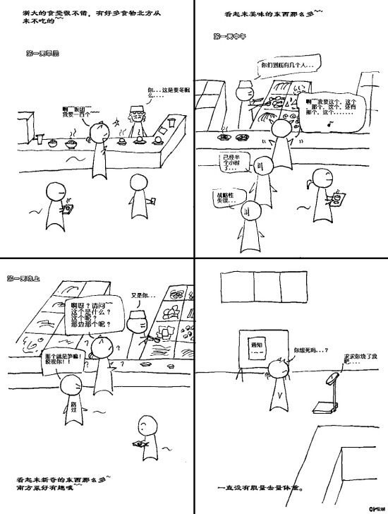 “很有生活氣息啊。樓主MM這一個(gè)月活得比我們4年還精彩啊。”網(wǎng)友直言,貼近生活的漫畫看起來輕松愉快,細(xì)細(xì)瀏覽,還會(huì)想起自己曾經(jīng)的菜鳥生活,“剛來紫金港的時(shí)候,我也幾乎天天迷路”,“想起自己剛進(jìn)大學(xué)的時(shí)候,也是對(duì)什么都好奇啊!