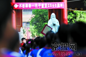 “拜,興,禮成!”今天是孔子誕辰2560周年紀念日,上午,孔廟舉行了傳統(tǒng)的拜師禮活動。國子監(jiān)中學(xué)初一年級的160名學(xué)生在孔廟大成門舉行了拜師禮。