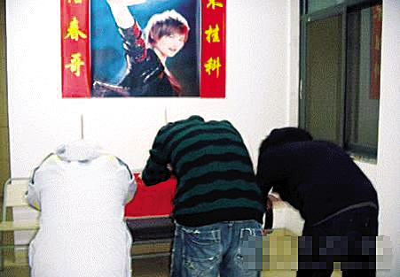 他與寢室同學商量,方案馬上得到全票通過。于是大家開始分工行動:去文星鎮(zhèn)買香爐、蠟燭與香,在學校商業(yè)街上的廣告公司訂制1×1.2米寬的李宇春海報。不久,寢室就被精心布置好了。上供品,燒高香,三鞠躬,儀式相當隆重。90后的小馬不無驕傲地向記者透露,這個點子絕對原創(chuàng),全國僅此一家。