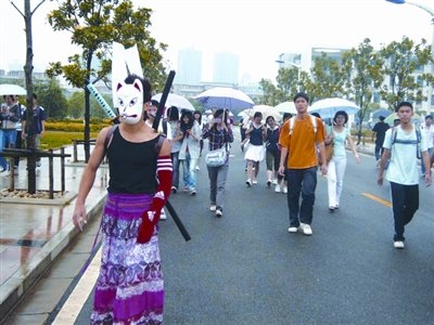 隨后,羅果找同學借來面具和忍者刀,找球迷們借了足球襪,又拿出老鄉(xiāng)送自己的娃娃,這樣就搭配出一身獨特裝扮。他大概在校園走了半個小時,引起了不小的轟動。最后,同學履約——請他到校外餐館撮了一頓。