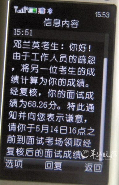 該負責(zé)人稱,得知此情況,他馬上叫一名姓蘇的工作人員電話告知鄧蘭英,告訴她剛才所發(fā)的成績通知書中,成績有誤,要求她返回考場更正。鄧聽后說,她已坐車在返回到徐聞的路上,該局人員于是承諾可支付其交通費,叫她速返回考場。但鄧不同意,最后,工作人員只好用手機13413633948(記者注:考場工作值班用的電話)發(fā)給鄧短信,對搞錯其成績一事表示抱歉并吩咐她于5月14日下午4時前到面試考場取經(jīng)復(fù)核后的面試成績(注:鄧收到短信時間是5月12日16時47分)。