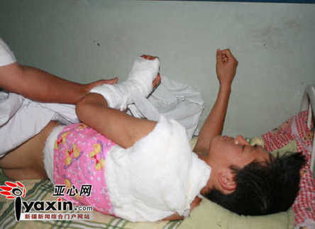 5月16日,記者在昌吉市人民醫(yī)院外一科見到了受傷的朱斌,他側(cè)著躺在病床上,說起話來很吃力。他的左臂、背部、胸部,腿部都被包扎了起來。