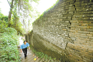 昨日下午5時(shí)左右,記者在現(xiàn)場(chǎng)看到,土堆有10多米高。在土堆最頂部,有一條貫通的裂縫,裂縫最寬處有8厘米左右。因受前晚昨晨的大雨沖刷,已無法確認(rèn)其是否是新發(fā)生的裂痕。土堆底部緊靠一堵圍墻,圍墻外是一條石板路,土堆最高處已堆至圍墻腰部。一部分圍墻已經(jīng)不存在——今年3月中旬的一場(chǎng)大雨后,土堆沉降,將這部分圍墻推倒。仍存的部分墻體,也已有松動(dòng)跡象,并有裂縫朝石板路一側(cè)發(fā)生傾斜。