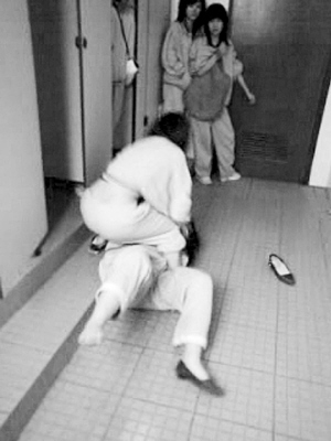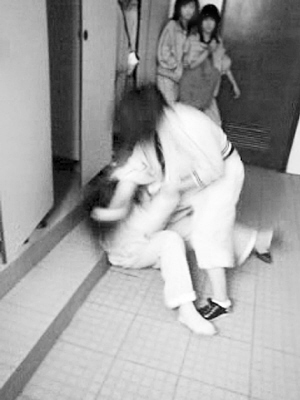 殷瓊是上海西南工程學(xué)校一年級(jí)學(xué)生。4月16日下午,她參加考試,題目差不多做完了,同學(xué)小成對(duì)她耳語(yǔ):“下課去校門口,有人找你談話!币蟓倹](méi)答應(yīng),小成幫她交卷,把她拉到校內(nèi)一幢大樓2樓女廁所門前,那里還有幾個(gè)女生在等著。拉扯進(jìn)廁所后,另一名同學(xué)劉幸一邊拍她肩膀挑釁,一邊讓其他女生打開手機(jī)攝錄。視頻記錄了殷瓊的噩夢(mèng),殷瓊的母親向記者出示了這段影像: