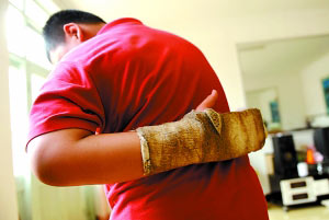 昨日下午,曹力強仍在家養(yǎng)傷,他左手打著石膏,兩顆門牙上可見裂痕。母親羅女士稱,近兩個多月來,兒子在學校兩次受傷。