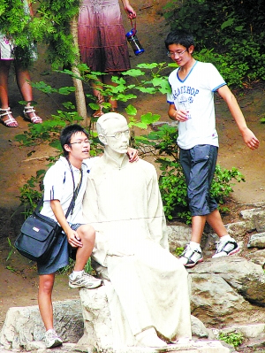 為了留下記憶,很多游客爭相和校園內(nèi)的雕塑合影。“安坐”在荷塘一角的“朱自清先生”非常受青睞。有的游客和“老先生”勾肩搭背,更有甚者,直接坐在“老先生”腿上照相。